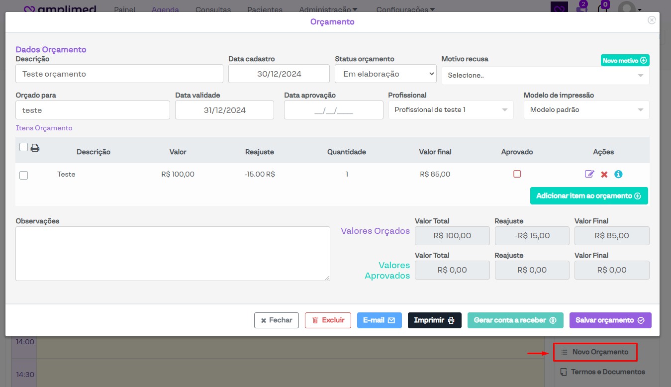 Essa função é utilizada para elaboração de orçamentos para os pacientes de forma ágil. Ao clicar nele, você será direcionada para uma nova janela para cadastrar um novo orçamento.