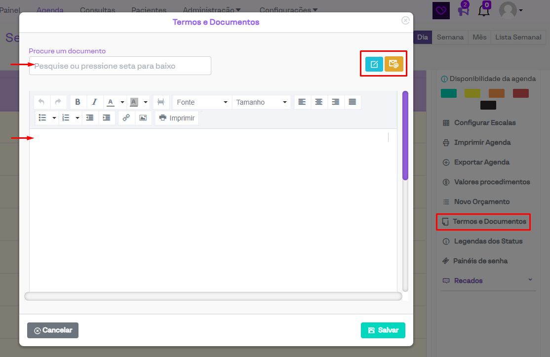 Essa opção da aba lateral da agenda permite a impressão de termos e documentos cadastrados no sistema ou ainda que eles sejam criados manualmente na tela de edição, com a finalidade de imprimi-los ou enviá-los por e-mail ao(s) paciente(s) desejado(s) de forma ágil.