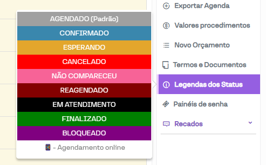 A legenda dos status tem a finalidade de orientar sobre a cor do agendamento de acordo com seu status padrão do sistema. Por exemplo, usando esta legenda, sabemos que se um agendado estiver em verde escuro, ele estará com o status "finalizado".