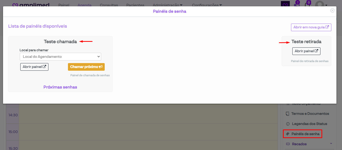 Os "Painéis de senha" são usados para auxiliar no check-in e para chamar os pacientes a partir de sua senha. Eles permitem organizar os atendimentos e facilitar informar os pacientes quando é momento de seguir para o atendimento (podendo ser chamado até mesmo pelo próprio profissional, quando este estiver pronto para atender).