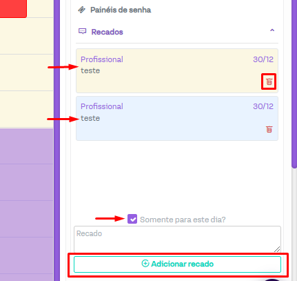 Os recados são usados como para lembrar de uma ação que precisa ser realizada, manter um aviso (no dia ou por mais dias) ou alguma informação importante na agenda de determinado profissional.