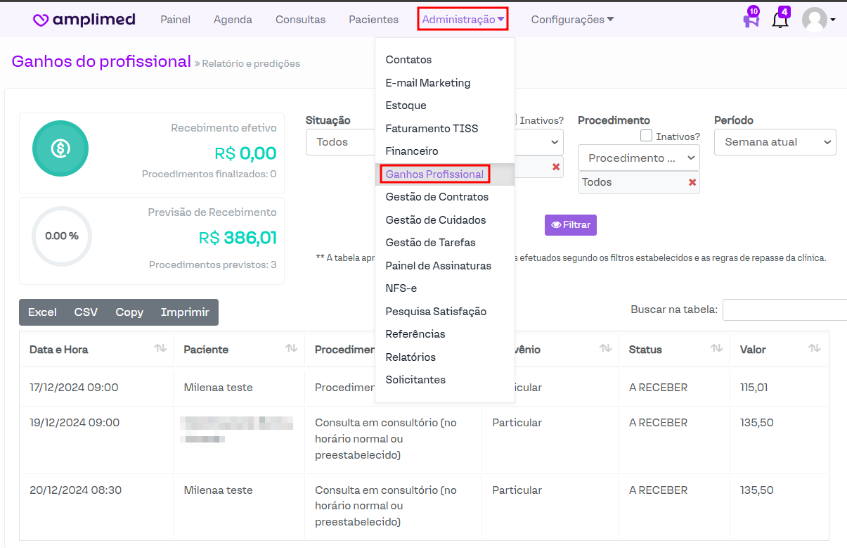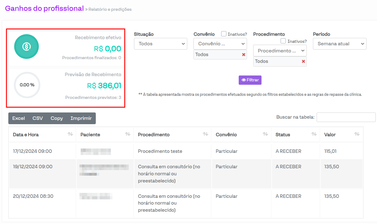 Previsão de Recebimento: É a soma total de todos os valores das contas a receber para o profissional, de acordo com a data de atendimento.