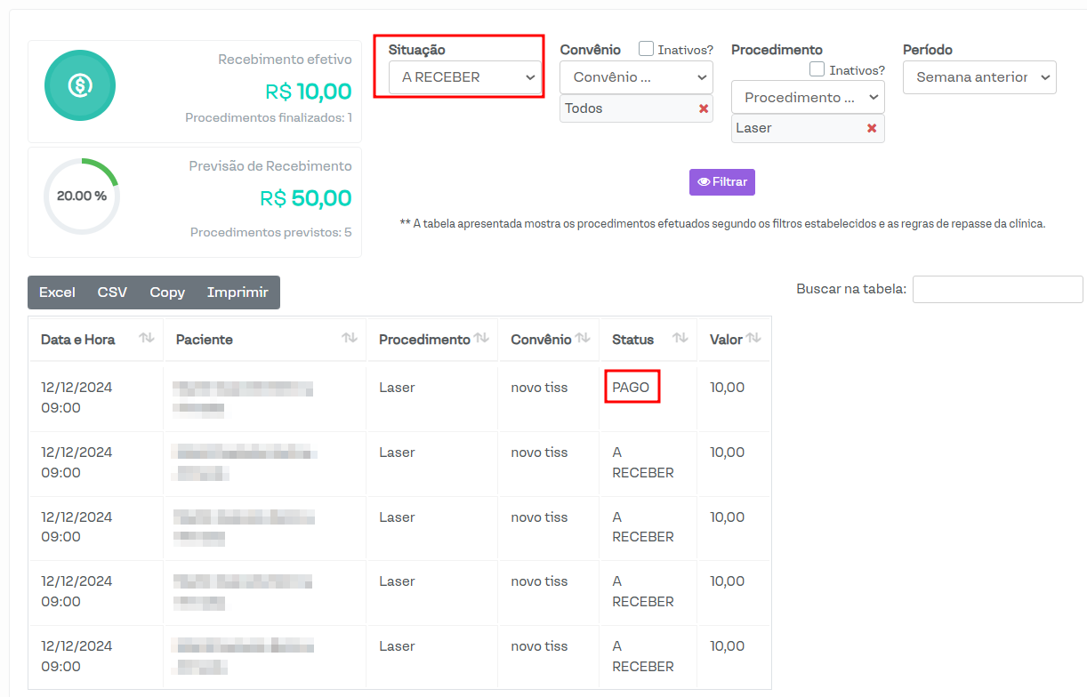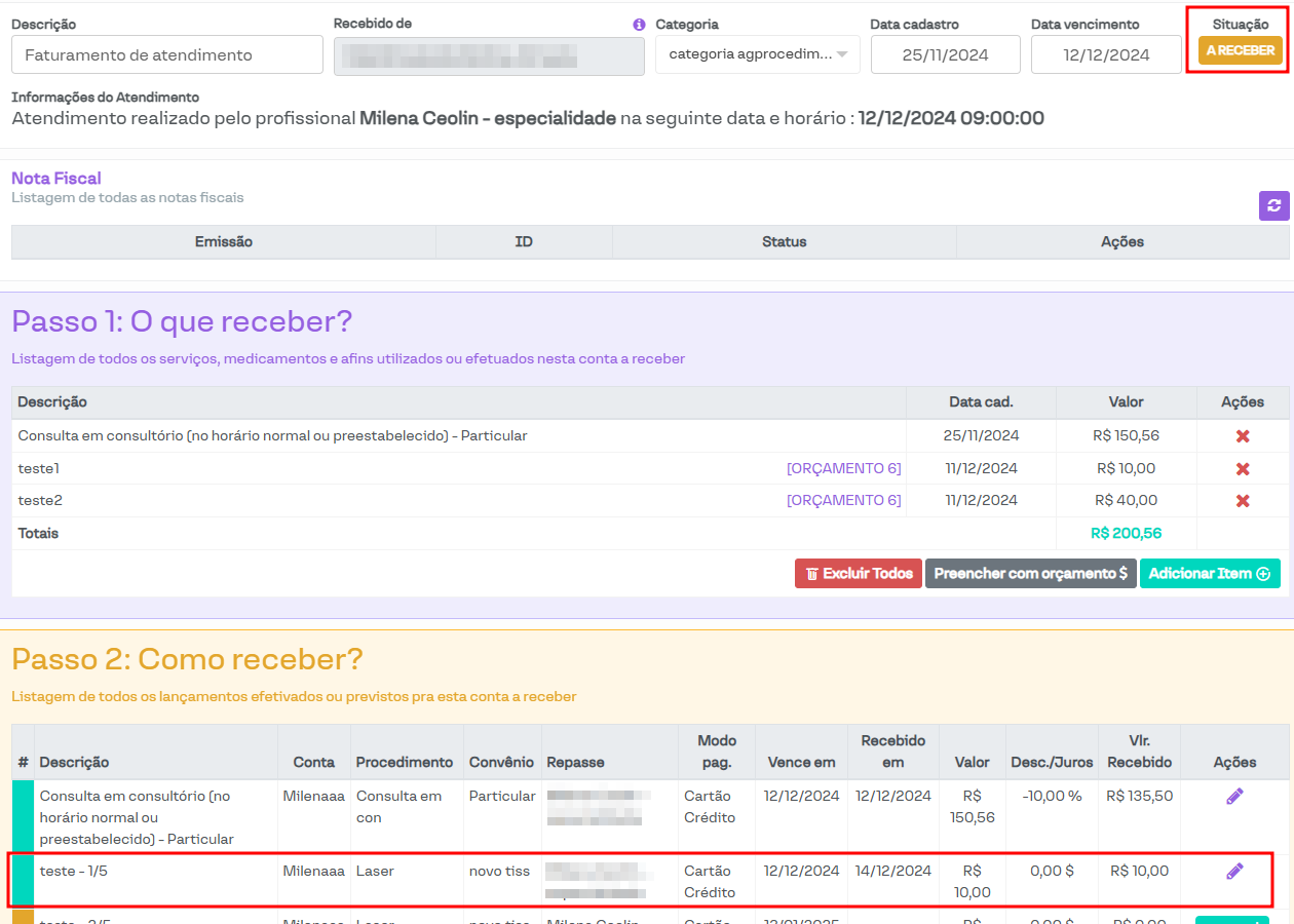Vale destacar que, mesmo em pagamentos parcelados com data de vencimento diferente da data de atendimento, eles serão listados, visto que o filtro é referente ao período de atendimento e não ao vencimento das contas.