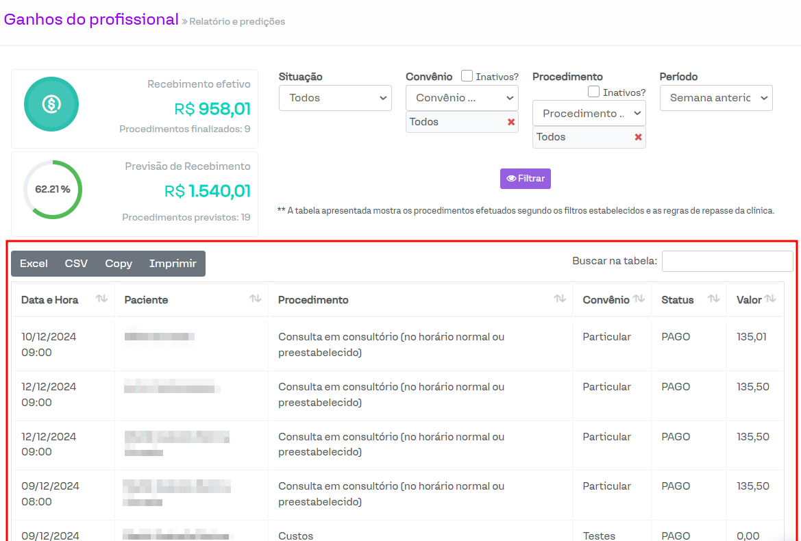 Além disso, abaixo dos valores e filtros, são apresentados os valores relacionados aos ganhos do profissional de acordo com os filtros selecionados. Vamos detalhar as colunas a seguir.