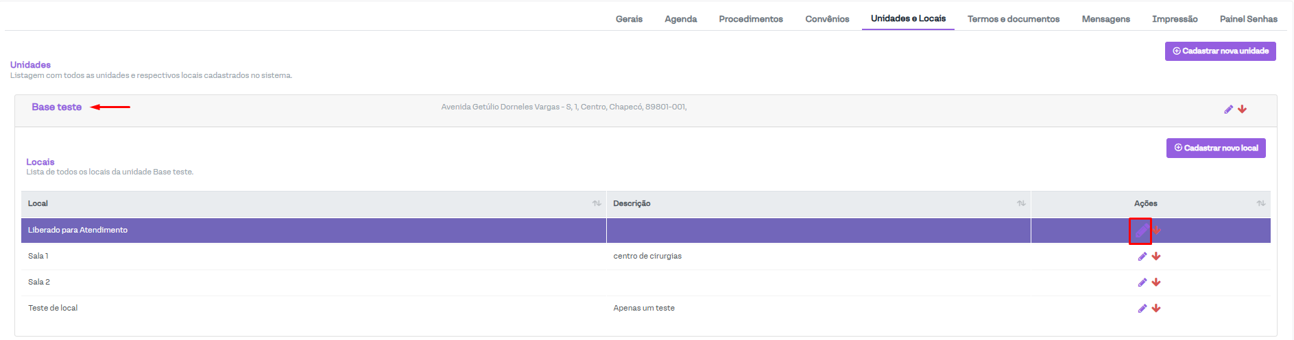 Para editar locais cadastros na sua clínica, primeiro clique sobre a unidade que o local está vinculado. Após encontrar o local desejado, clique no ícone de lápis, em roxo, localizado à direta da tela, na coluna "Ações".