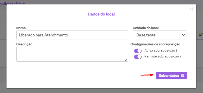 Um nova tela será exibida, onde é possível ajustar as informações do local, como o nome, descrição (opcional) e as configurações de sobreposição. Finalizado os ajustes desejados, basta clicar em "Salvar dados", para concluir a edição.