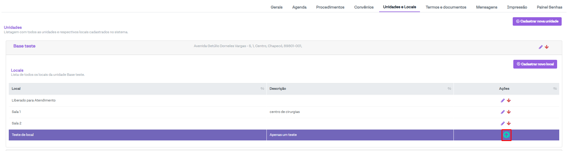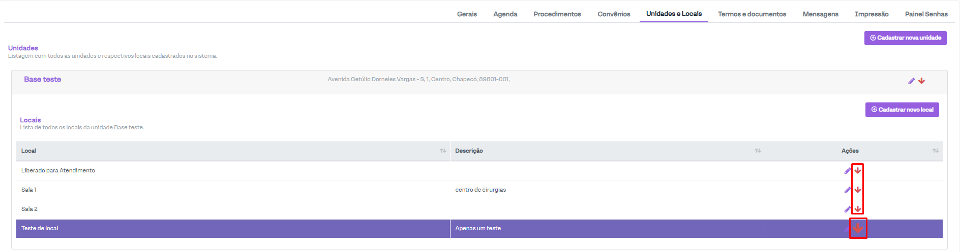 Caso seja preciso desativar algum local cadastros que não será mais utilizado, basta clicar sobre a unidade em que o local está vinculado. Encontre o local desejado e selecione o ícone de seta para baixo, em vermelho, localizado à direta da tela, na coluna "Ações".
