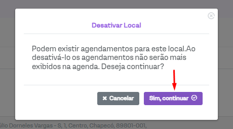Será exibida uma tela de confirmação, alertando sobre a possibilidade de que se existirem agendamentos cadastrados para este local, eles deixaram de aparecer na agenda. Caso esteja tudo em ordem com os agendamentos, clique no botão "Sim, confirmar", para concluir a desativação.