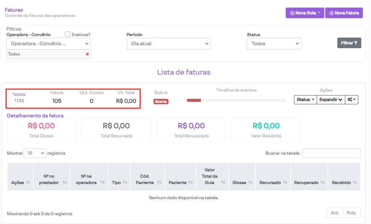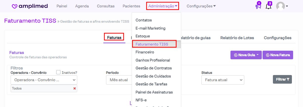Nesta seção do sistema, é possível criar e gerenciar as faturas das guias TISS cadastradas. Além disso, é possível gerar lotes e arquivos XML para envio posterior às operadoras.
