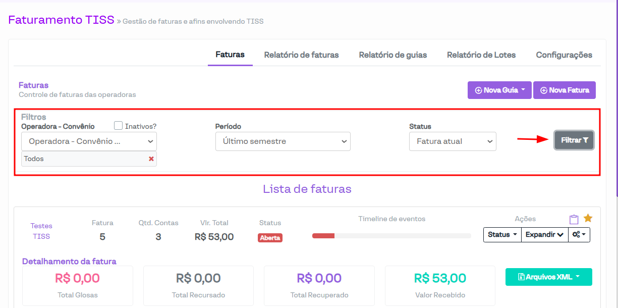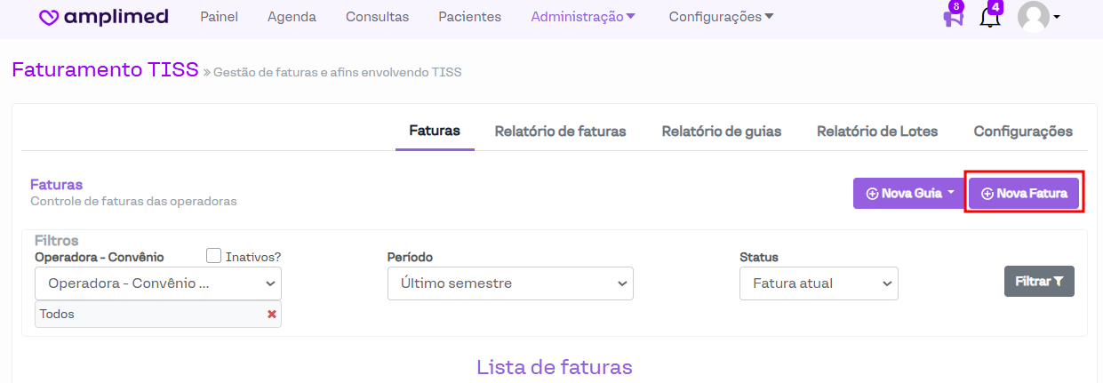 Para visualizar as fatura já geradas, ajuste os filtros Operadora, Período e Status conforme necessário e, em seguida, clique no botão Filtrar.