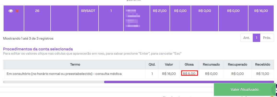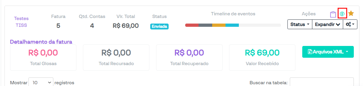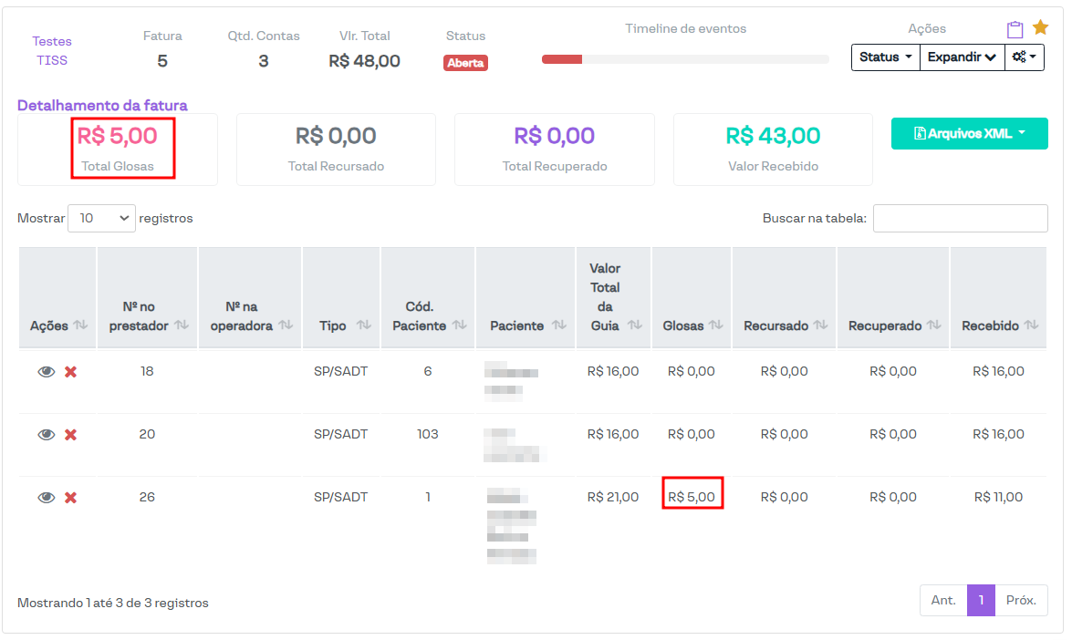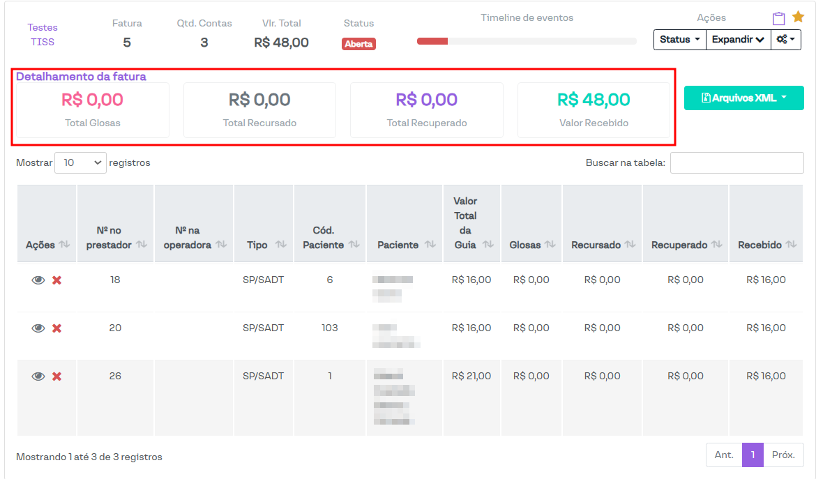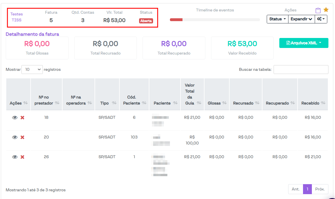 Abaixo dessas informações, são apresentados detalhes da fatura, como os valores de glosa, recusado, recuperado e recebido, conforme destacado na imagem abaixo.