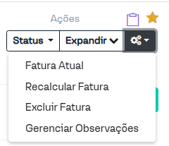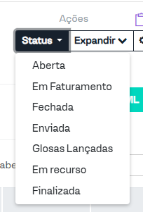 Ao lado, estão os botões Status, Expandir e Configurações (ícone de engrenagem). O botão Status permite alterar o status da fatura para uma das opções exibidas na imagem a seguir: