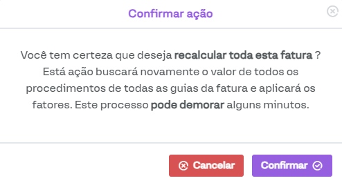 Além disso, esse botão permite Recalcular Fatura. Ao clicar nessa opção, será exibido um aviso, conforme mostrado na imagem abaixo. Basta confirmar para que o cálculo seja realizado. Vale destacar que, se uma guia foi excluída da fatura, ela não será reincluída com essa ação.
