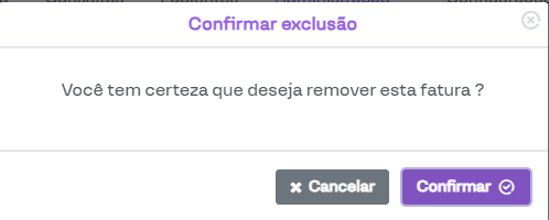 Ademais, é possível realizar a Exclusão da Fatura. Ao selecionar essa opção será exibida uma imagem de confirmação da ação, basta clicar em Confirmar e a fatura será excluída.