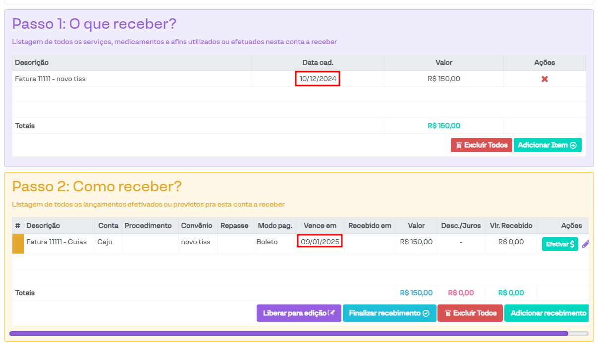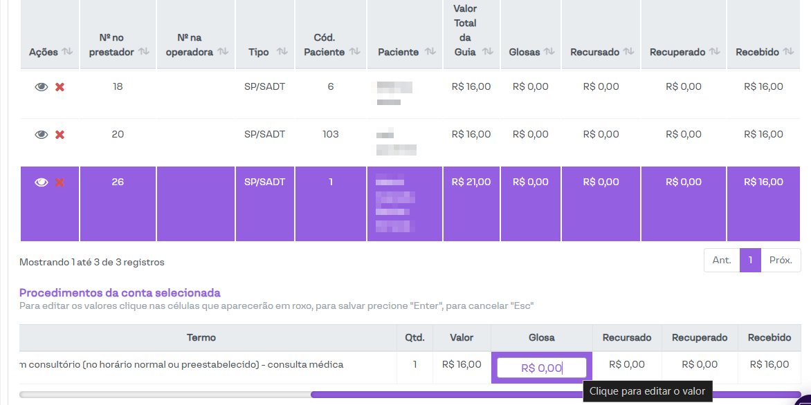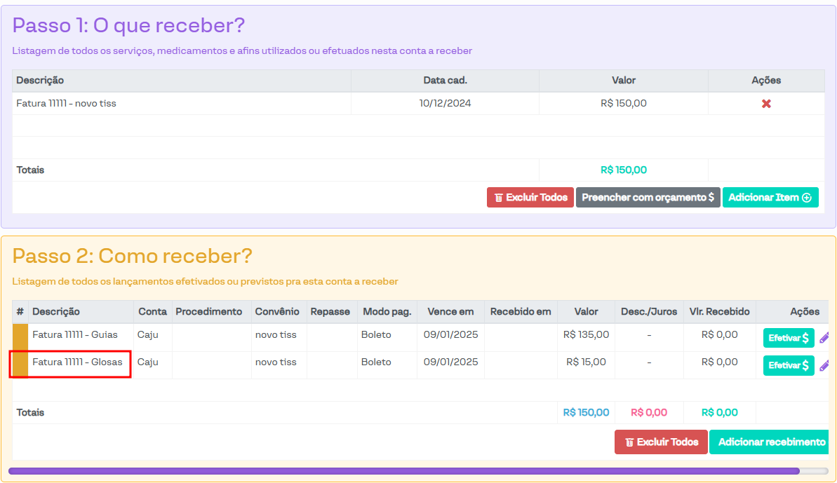 Pronto, agora, no seu financeiro, a conta original a receber terá dois itens: um com o valor das guias que não deram glosas e o outro com o valor das que deram.