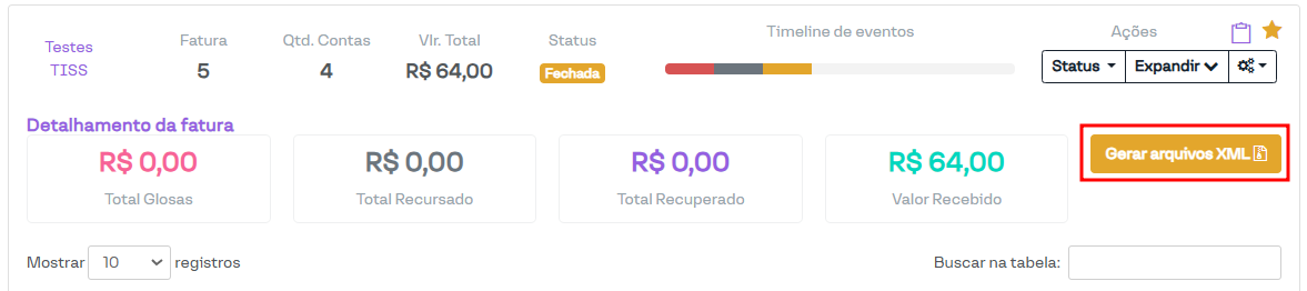 Para gerar o lote de uma fatura, o status da fatura precisa estar definido como Fechada. Com a fatura nesse status, o botão Gerar arquivos XML será habilitado, conforme ilustrado na imagem abaixo.