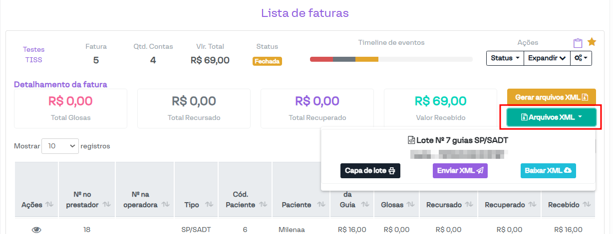 Após a geração do arquivo, será habilitado um novo botão, Arquivos XML, que permite realizar as seguintes ações: baixar o(s) arquivo(s) XML gerado(s), visualizar a capa do lote gerada e, para clínicas com integração com operadoras, enviar o XML do lote diretamente para o sistema da operadora.
