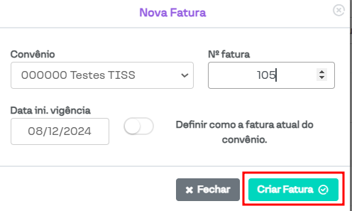 Em seguida, será aberta uma janela para informar os seguintes dados: convênio, número da fatura, data de início da vigência da fatura e se ela será definida como a fatura atual para o convênio.