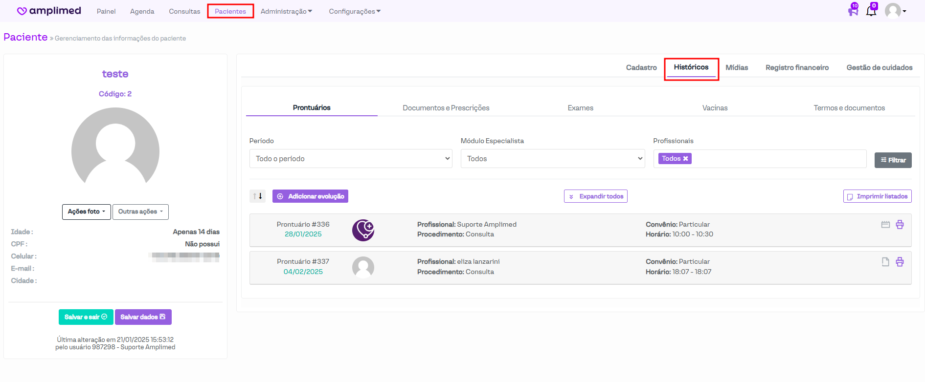 Após acessar o módulo de Pacientes, irá aparecer a listagem de pacientes cadastrados. Selecione então um paciente e clique sobre o nome dele para abrir os detalhes, após clique em Históricos terá acesso a aba de Prontuário