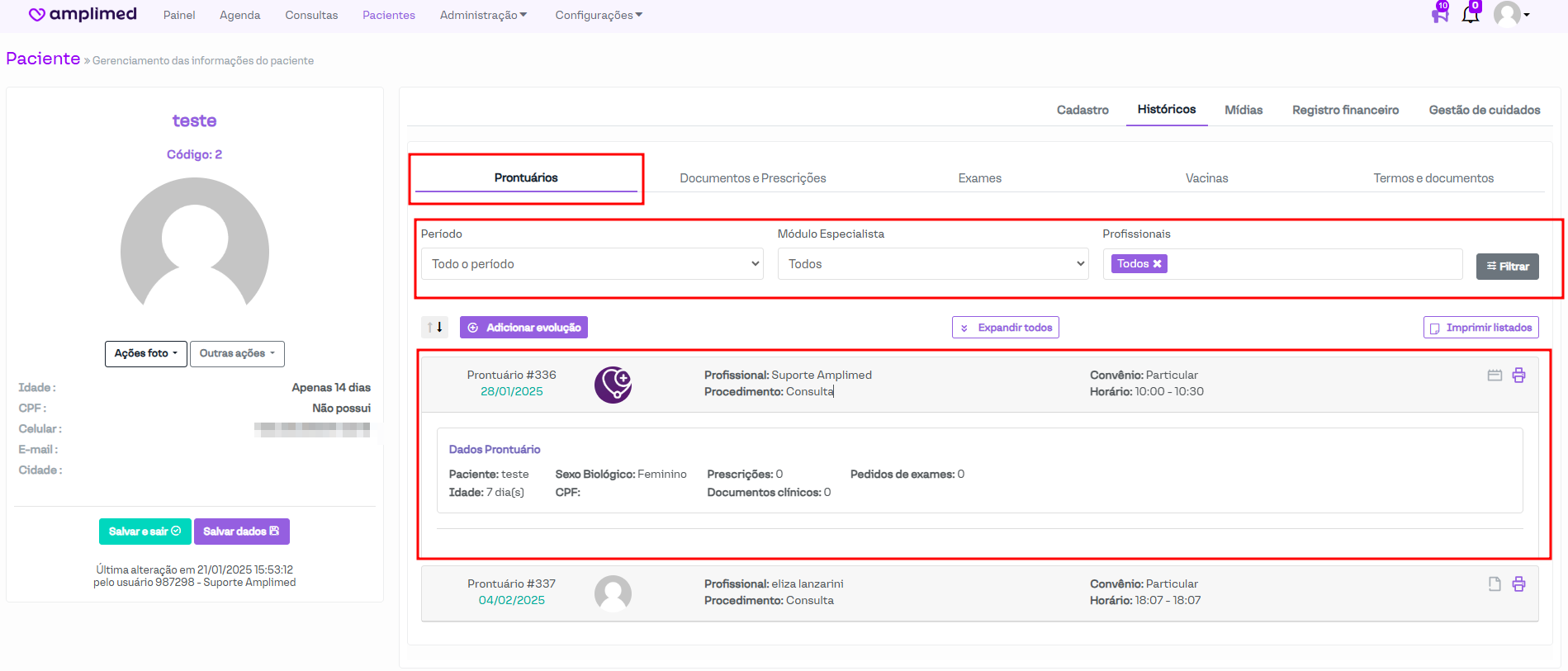 Também será possível visualizar detalhes do prontuário, após clicar em um deles.