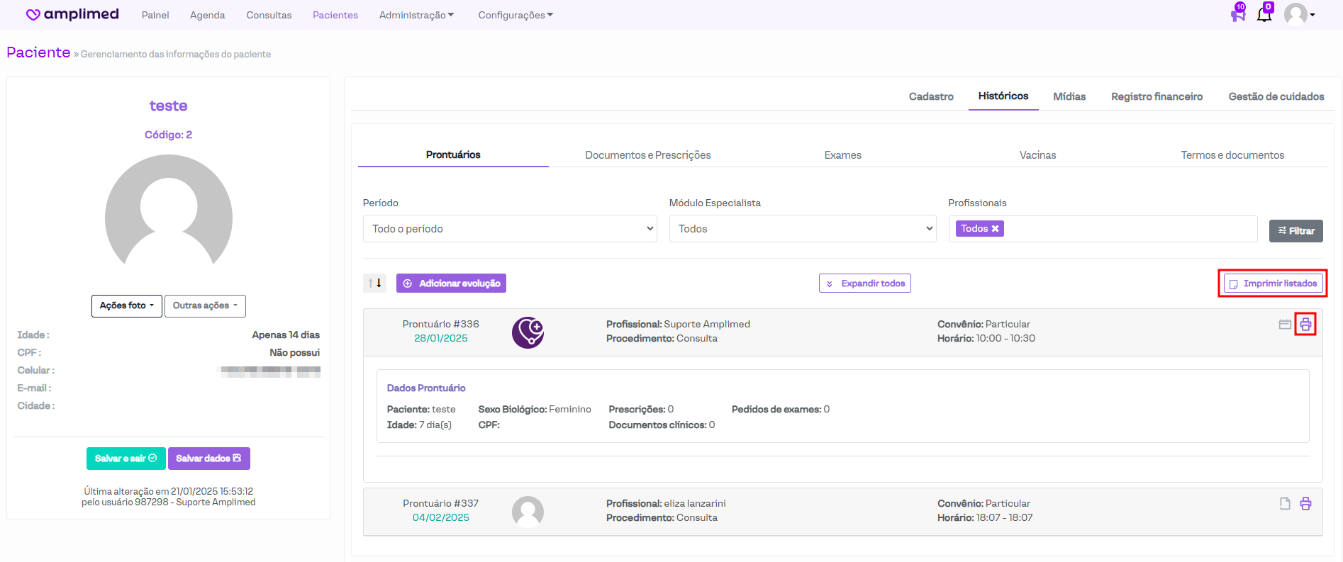 Caso queira imprimir todos os prontuários, clique em Imprimir listados, ou para impressão individual expanda o prontuário clicando nele e terá um ícone para impressão individual: