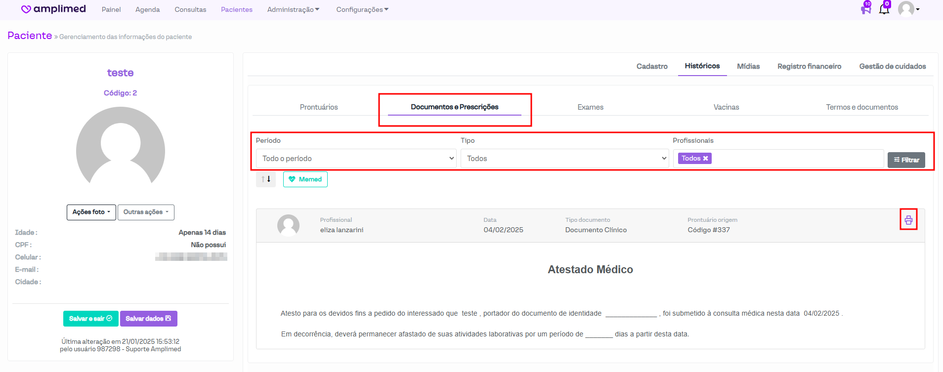 Acessando a aba de Documentos Prescrições, será possível verificar o histórico emitido, utilizar filtros para busca de documentos, clicar neles para expandir o conteúdo e também imprimir: