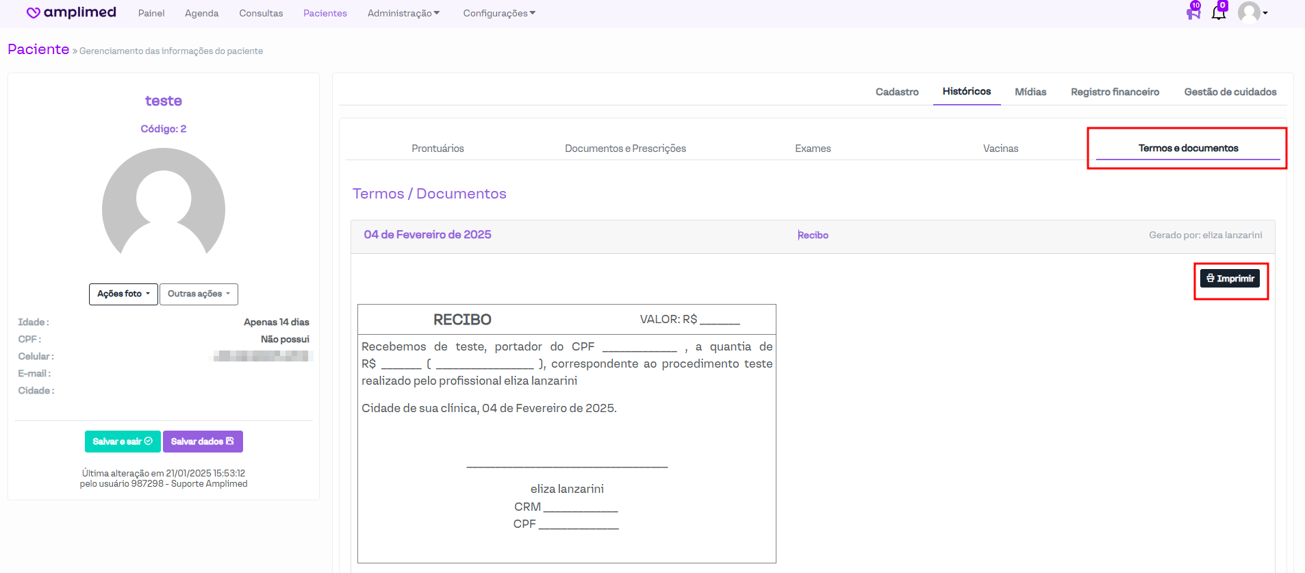 Acessando a aba de Termos e Documentos, será possível verificar o histórico emitido, clicar neles para expandir o conteúdo e também imprimi-los.