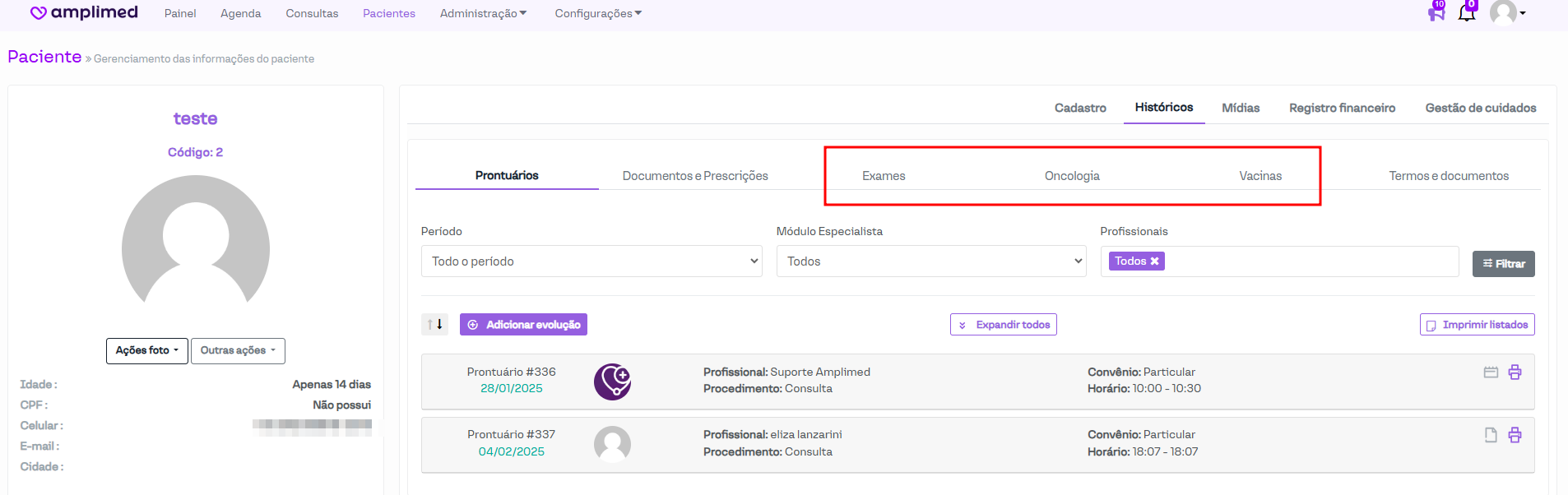 Caso sua clinica tenha Módulos Adicionais, como exemplo Modulo de Vacinas, será nessa aba de histórico que os dados irão aparecer.