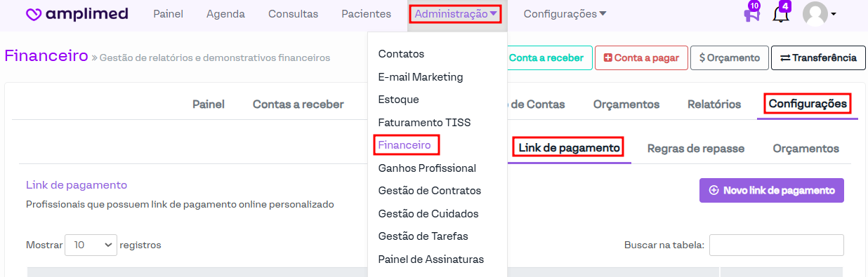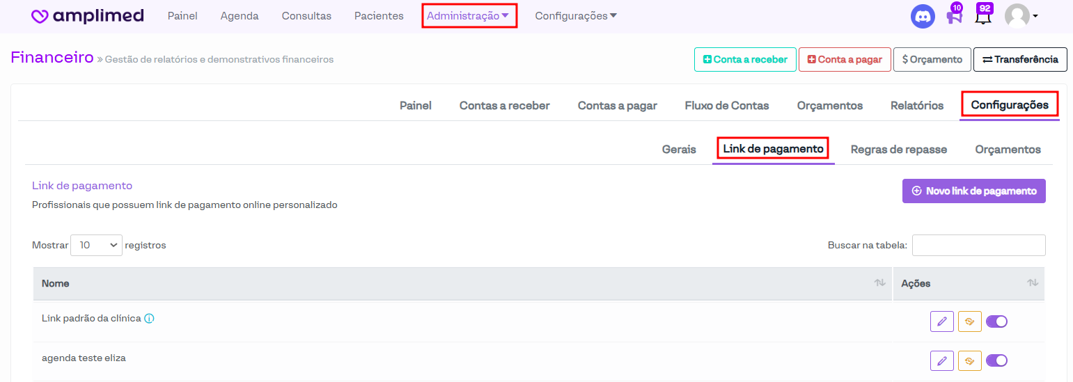 Acesse: Administração > Financeiro > Configurações > Link de pagamento
