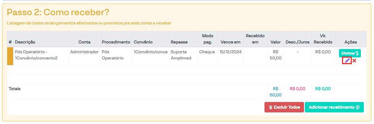Para criar um link na conta a receber, basta abrir a conta a receber desejada e clicar no botão de editar (ícone de lápis), destacado na imagem a seguir.
