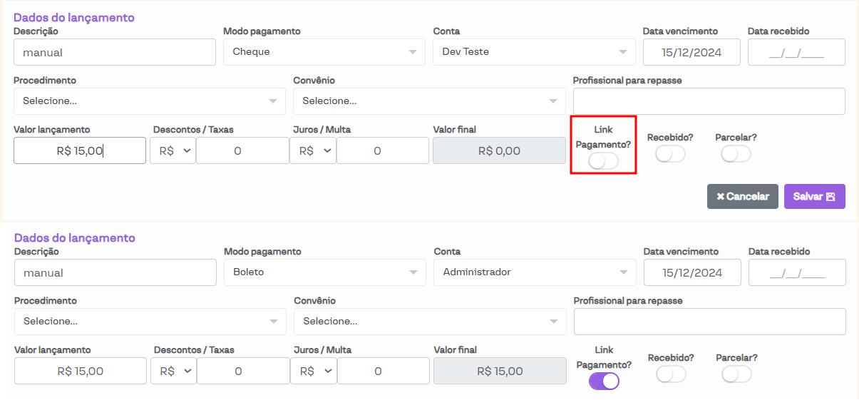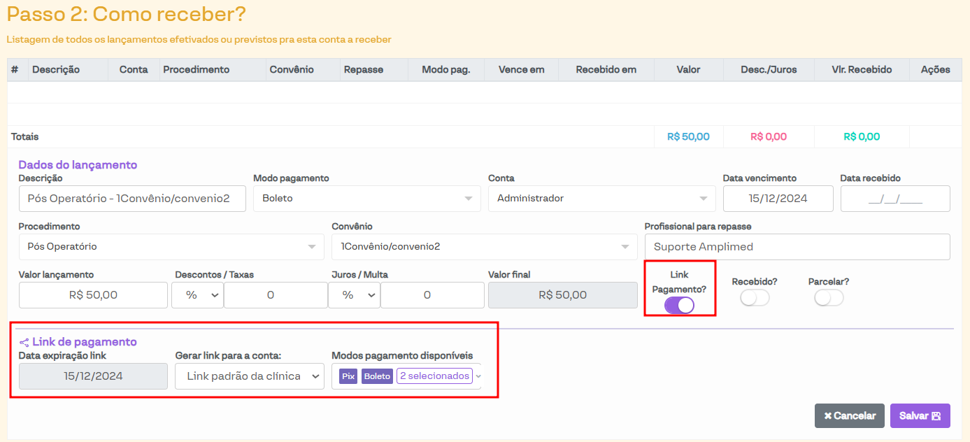 Data expiração do link: Permite definir a data até a qual o link será válido para pagamento pelo paciente. Geralmente, essa data coincide com a data de vencimento da conta.