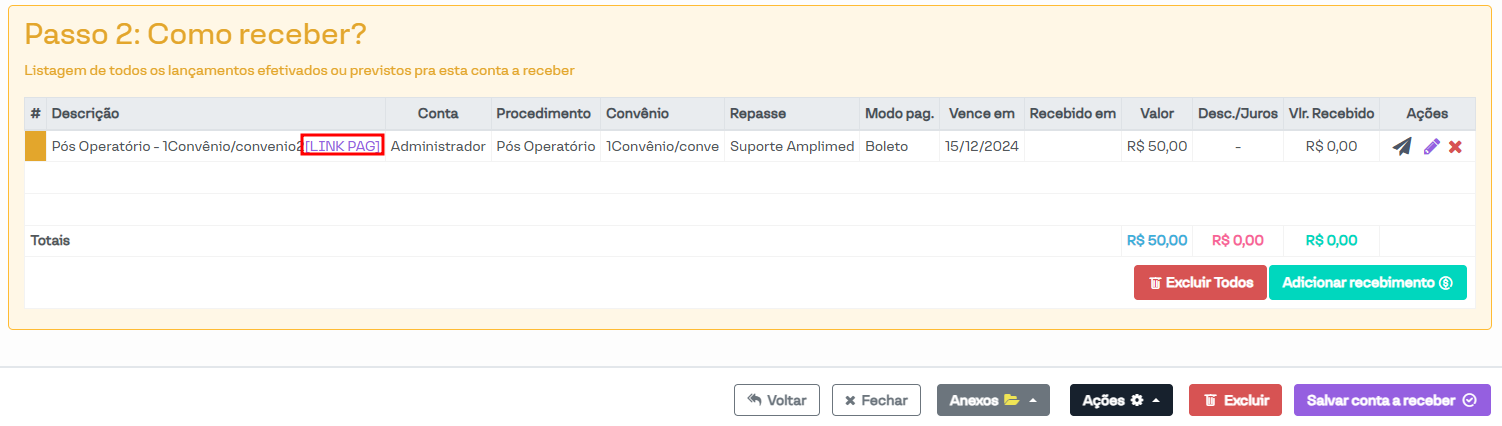 Para as clínicas que possuem o módulo contratado, é possível gerar um link de pagamento para enviar aos pacientes e vinculá-lo a uma conta a receber.