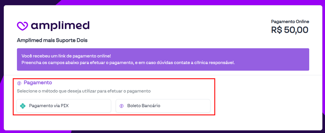 O link gerado possibilitará a seleção do pagamento conforme a opção definida no momento da criação do link, conforme a imagem a seguir.