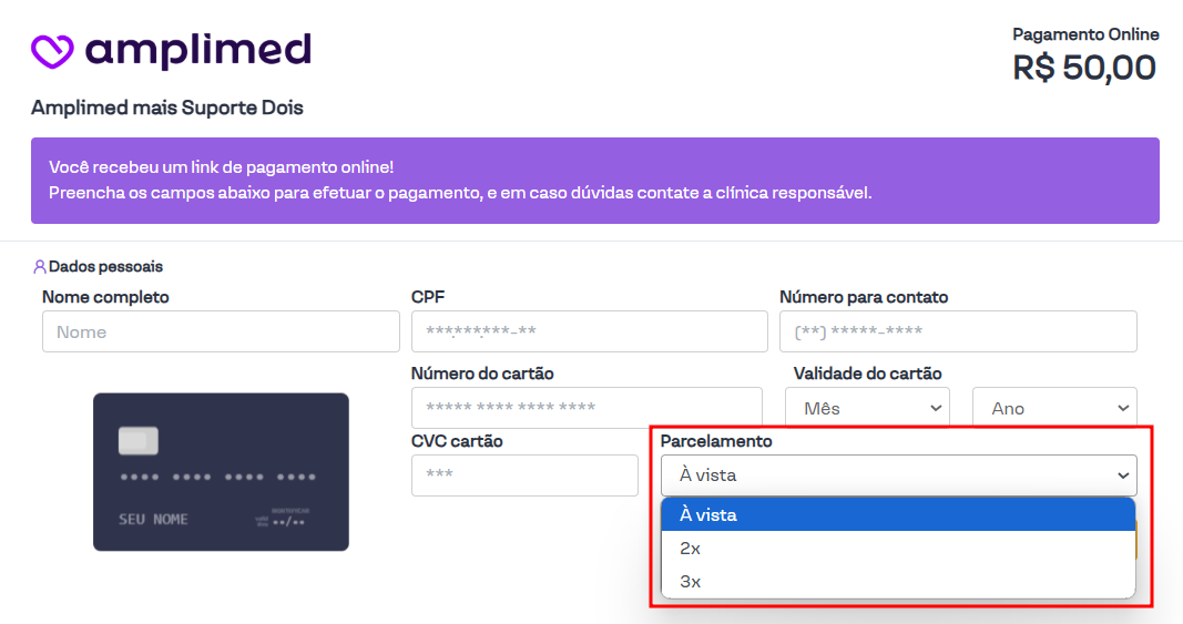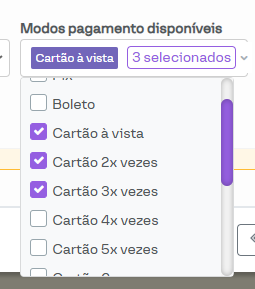 Vale destacar que, para pagamentos no cartão de crédito, é necessário selecionar as opções de parcelamento que serão apresentadas ao paciente. Por exemplo, para permitir que o paciente escolha entre pagamento à vista, em 2x ou 3x, é necessário selecionar todas essas opções, conforme a imagem a seguir.