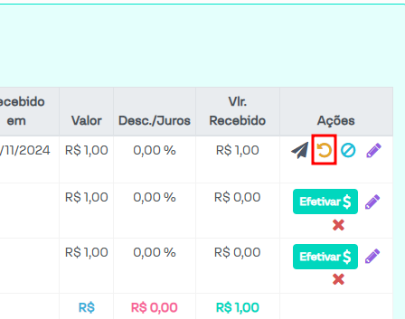 Para estornar o pagamento realizado, basta clicar no botão em forma de seta circular, destacado na imagem a seguir.