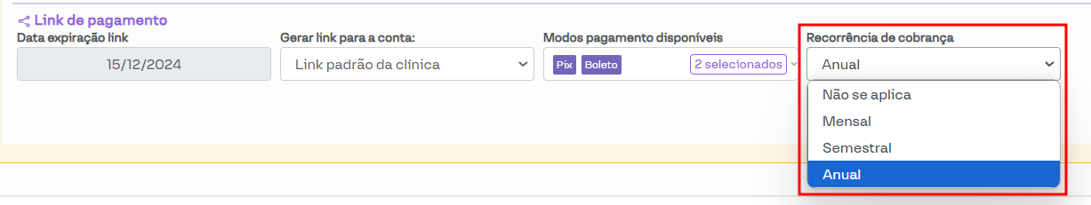 Em alguns casos, o sistema possibilita a cobrança recorrente ao paciente. A recorrência funciona como um plano de assinatura, no qual o sistema solicita a frequência com que o pagamento será realizado pelo paciente.