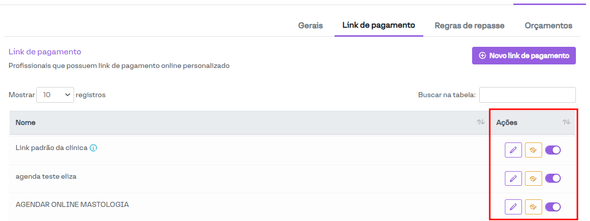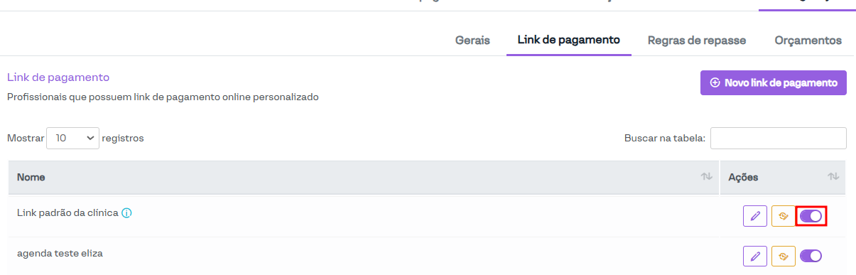 Além disso, é possível ativar ou desativar o link de pagamento, impedindo que ele seja selecionado na opção Gerar link para a conta.