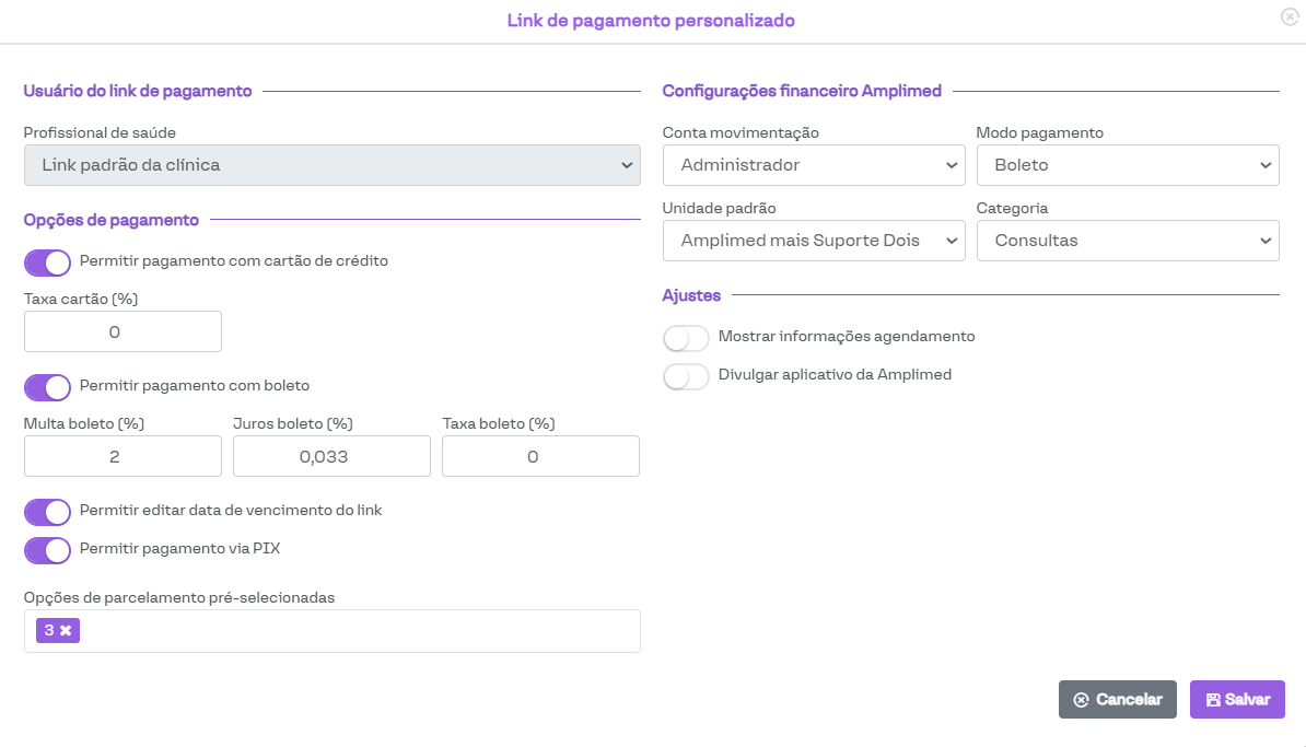 Modos de pagamento disponíveis: Permite selecionar as formas de pagamento disponíveis para o paciente escolher no momento do pagamento.