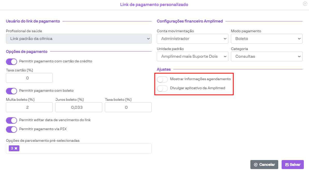 Por fim, alguns ajustes podem ser realizados no link de pagamento.