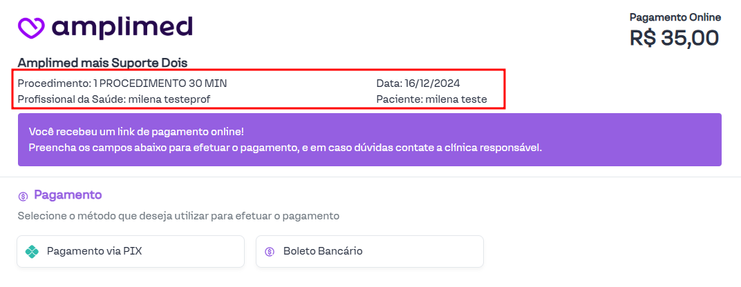 A opção Mostrar informações de agendamento permite que algumas informações relevantes sobre o agendamento apareçam no link de pagamento, conforme a imagem a seguir.