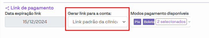 Gerar link para a conta: Permite selecionar a conta à qual o link será vinculado. Neste campo, serão exibidas várias opções apenas se várias contas estiverem configuradas para a clínica no módulo de pagamentos (diferente das contas criadas no sistema).