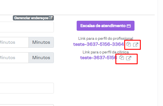 Os links de agendamento são acompanhados de dois botões. O botão de "Copiar" (a esquerda) e o de "Abrir em uma nova aba" (a direita). Ao copiar o link, o mesmo poderá ser enviado diretamente para o paciente ou para se inserido em algum local desejado, já ao clicar em abrir o link em uma nova aba, você será direcionado ao campo de agendamentos.
