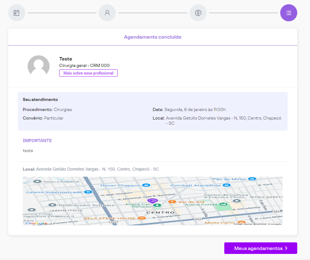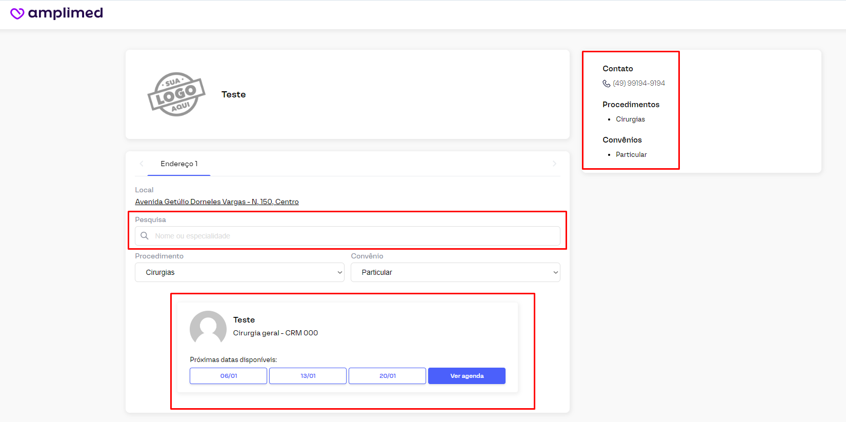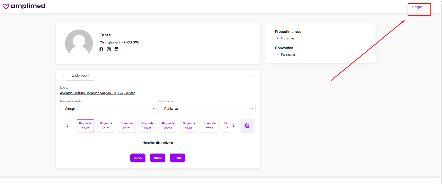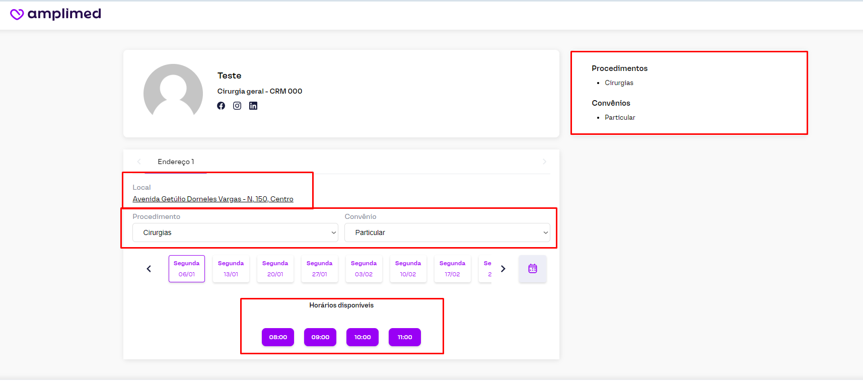 O link para o perfil do profissional irá direcionar o paciente diretamente para a agenda do profissional. Nesse campo será possível o paciente escolher o local de atendimento do profissional (caso haja mais do que um), o procedimento que deseja realizar e qual convênio o paciente utiliza.