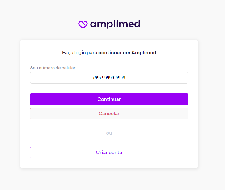 Ao clicar em Login o paciente será direcionado ao capo de cadastro. Nesse campo inicialmente ele deve inserir o seu número de contato, onde após clicar em continuar ele receberá um código de verificação via SMS.