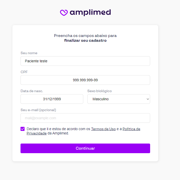 Após o código inserido o paciente será direcionado para o preenchimento dos dados do seu cadastro. Nesse campo dele deve informar o nome completo, CPF, data de nascimento, sexo biológico e seu e-mail sendo esse opcional.