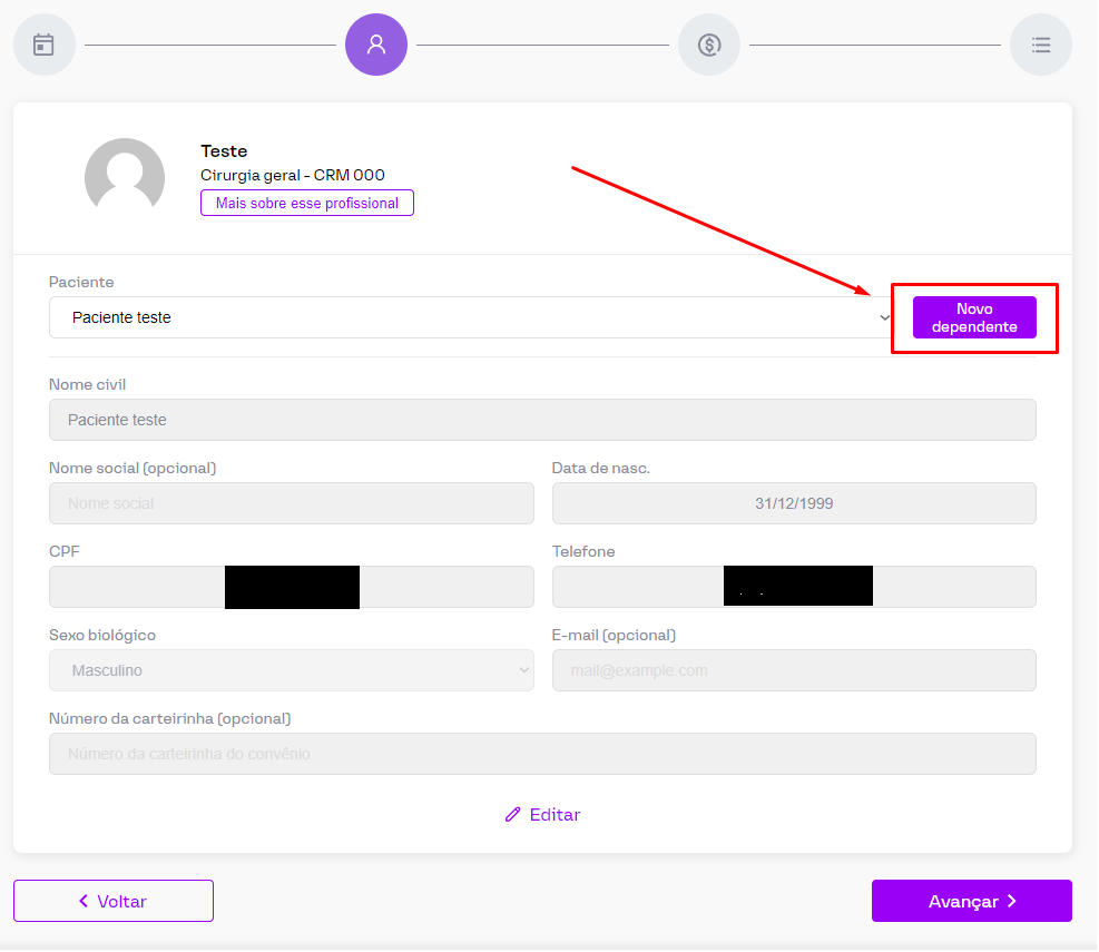 Com essas informações selecionadas o paciente será direcionado a um novo campo onde poderá revisar suas informações e caso necessário adicionar um novo dependente ou editar as informações já existentes