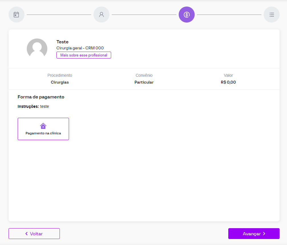 O modo de pagamento pode ser escolhido pelo paciente conforme disponibilidade da clínica. Caso a clínica não possua mais modos ele deve deixar selecionada a opção "Pagamento na clínica". Após isso basta clicar em "Avançar"