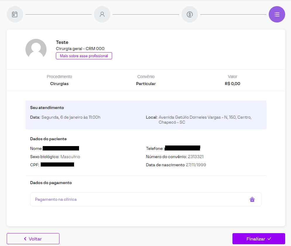 Contudo conferido basta clicar em "Finalizar", e pronto! O agendamento foi feito de forma online diretamente pelo paciente!