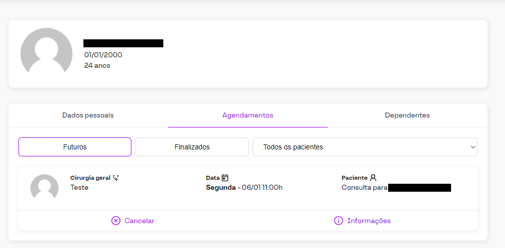Ele também poderá estar clicando em "Meus agendamentos" para verificar informações de agendamentos futuros, finalizados ou de dependentes.