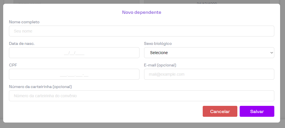 Após incluir as informações basta clicar em "Salvar", assim o dependente ficará disponível para ser selecionado no campo "Paciente".